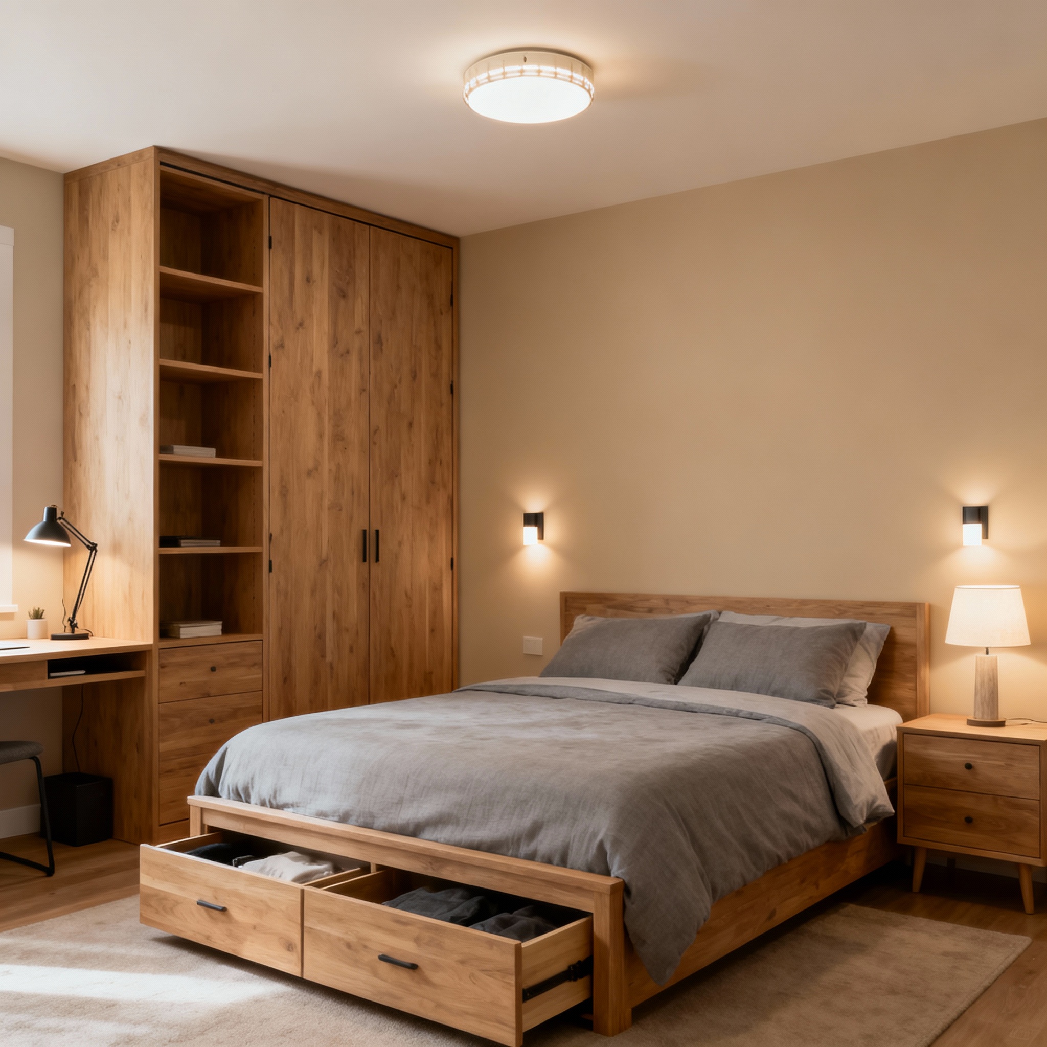 Vertical solutions: Place wall-mounted shelves or high cabinets to maximize headroom. A tall dresser or a shelf over a desk frees up floor area while keeping things organized.