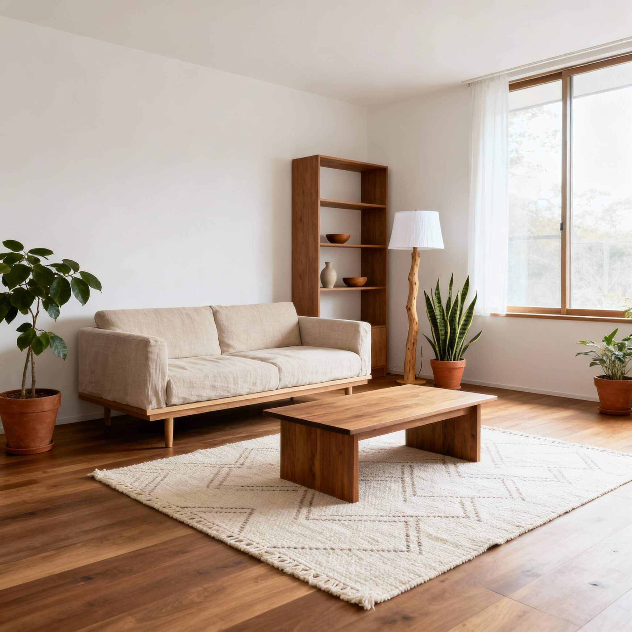 Add decor elements that fit the theme: a textured area rug under the seating area, some throw pillows in muted earth-tone colors, perhaps a set of simple ceramic vases or a bamboo tray on the table.
